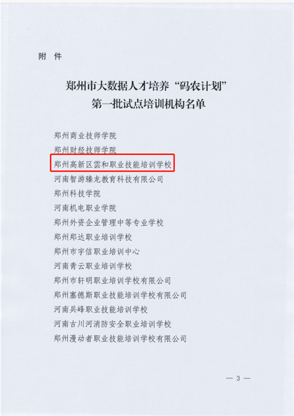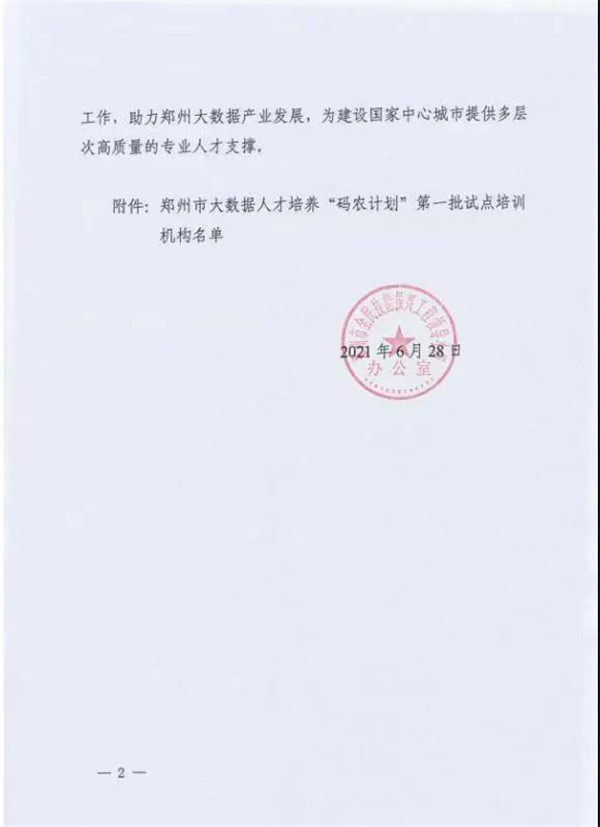 6月28日下午,郑州市全民技能振兴工程领导小组办公室颁发文件,文件中提到:为贯彻落实《郑州市人民政府办公厅 关于印发大数据人才培养“码农计划”实施方案的通知》(郑政办[2021]12号)文件精神,经单位申报、实地考察、市全民技能振兴工程领导小组办公室研究,现将我市开展大数据人才培养“码农计划”第一批试点培训机构名单予以公布。这其中有应用型本科院校、职业(技工)院校与培训机构,经过郑州市政府“码农计划”调研小组的严格把关、层层审核,最终在百余所机构中臻选出有资质、有能力承接的共15所。云和数据作为规模更大、更具影响力的紧缺、核心ICT人才生态服务国家级高新技术企业,位列其中。(详情文件见下图)