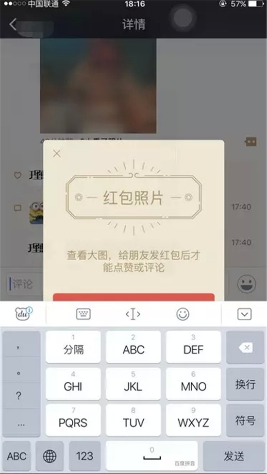 姿势四:iOS手机+百度输入法+朋友回复。具体操作如下:点击红包照片下的评论框,红包出来的时候,输入法也弹出来了,大胆输入评论等待朋友回复,回复后进入消息列表,右侧小图点开高清大图随便看!!