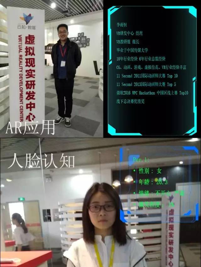人脸识别:将HoloLens中的光标校准到想要识别的人脸上,进行拍摄,等待官网为我们返回的数据,数据就会呈现在Hololens当中,体验者便可以通过返回的数据得知被识别人的年龄,性别,以及心情等。